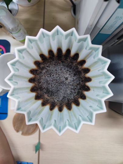 豆香:淡淡的红枣甜感和果酒香味 粉干香:红枣+一点点曲奇的甜味 冲煮:栗子c2-20格,90℃,粉水比1:13,origami折纸滤杯,一刀流75ml焖蒸,剩余水量一次性注入,总用时2m45s(拉长了焖蒸的时间和水量,意图是保证焖蒸完全) 咖啡液香:浓郁的果酒香味和红枣甜感 高温口感:直接喝是浓郁混杂的味道,很杂分辨不出来,bypass调整之后可以喝出前段果酒味+一点苦涩的杂味,暂时没能分出来是什么杂味,后端回红枣尾韵 温度下来一点之后:后段红枣的甜感有加强一些,果酒的风味被杂味盖住了一点 室温口感:红枣和果酒的风味都流失了,只剩杂味 不确定是意式豆被拿来做手冲导致的还是冲煮手法导致的,总感觉会有杂味,初步感觉是因为拼配考虑的是做意式而不是手冲,所以用手冲去做风味不太平衡,改天用意式机再试一下这个豆子吧。