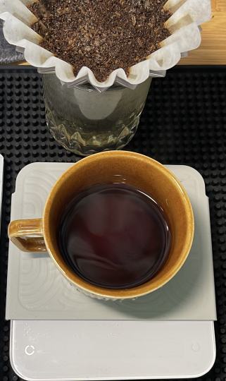手冲 烘焙度:浅度烘焙 处理方法:酵素水洗 冲煮器具:origami折纸滤杯 研磨度:1z k-plus 8.0 水温:92°C 水粉比:1:15 时长:1:50 风味介绍:柠檬、桃子、李子、乌龙茶 香气:🌟🌟🌟🌟 酸感:🌟🌟🌟 甜感:🌟🌟 总结: Samda 家的豆子质量还是很好的,豆子的大小和烘焙度都很可以,这支是老板送的品鉴装,但最近不太喜欢酵素处理的豆子,所以比较影响评分,开袋立刻就可以闻到水蜜桃果汁味,接下来是珍珠奶茶味,应该就是风味描述里的乌龙茶味,这一点和之前喝的那款很像,磨完粉之后虽然减弱了,但闻起来还是很桃子奶油乌龙茶。用的是三段式冲煮,想着应该会冲出多一些风味。湿香也是桃汁味,但和桃子奶茶味不一样,更像是小时候喝的汇源果汁的味道。喝的时候,先是蜜桃奶油风味进入鼻腔,高温段喝起来口感轻薄、干净,苹果酸的感觉,有一点涩,但酸感后段有上扬,回甘也是很桃子但很短暂。中低温段,更偏向柠檬酸,回甘有所提升,停留时间更长。